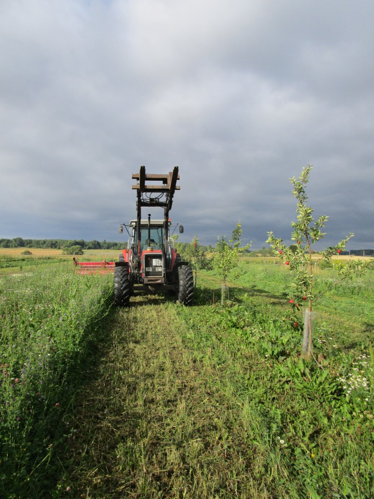 We seeded a mixture of pea and rye between the rows of trees and bushes.